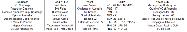 Syndicate Yacht Sail #NZL Challenge New Zealand NZL- 20Il Moro de Venecia I Moro de Venecia ITA - 25Nippon Challenge Nippon JPN - .26Le Defi Francais 95 Ville de Paris FRA - 27